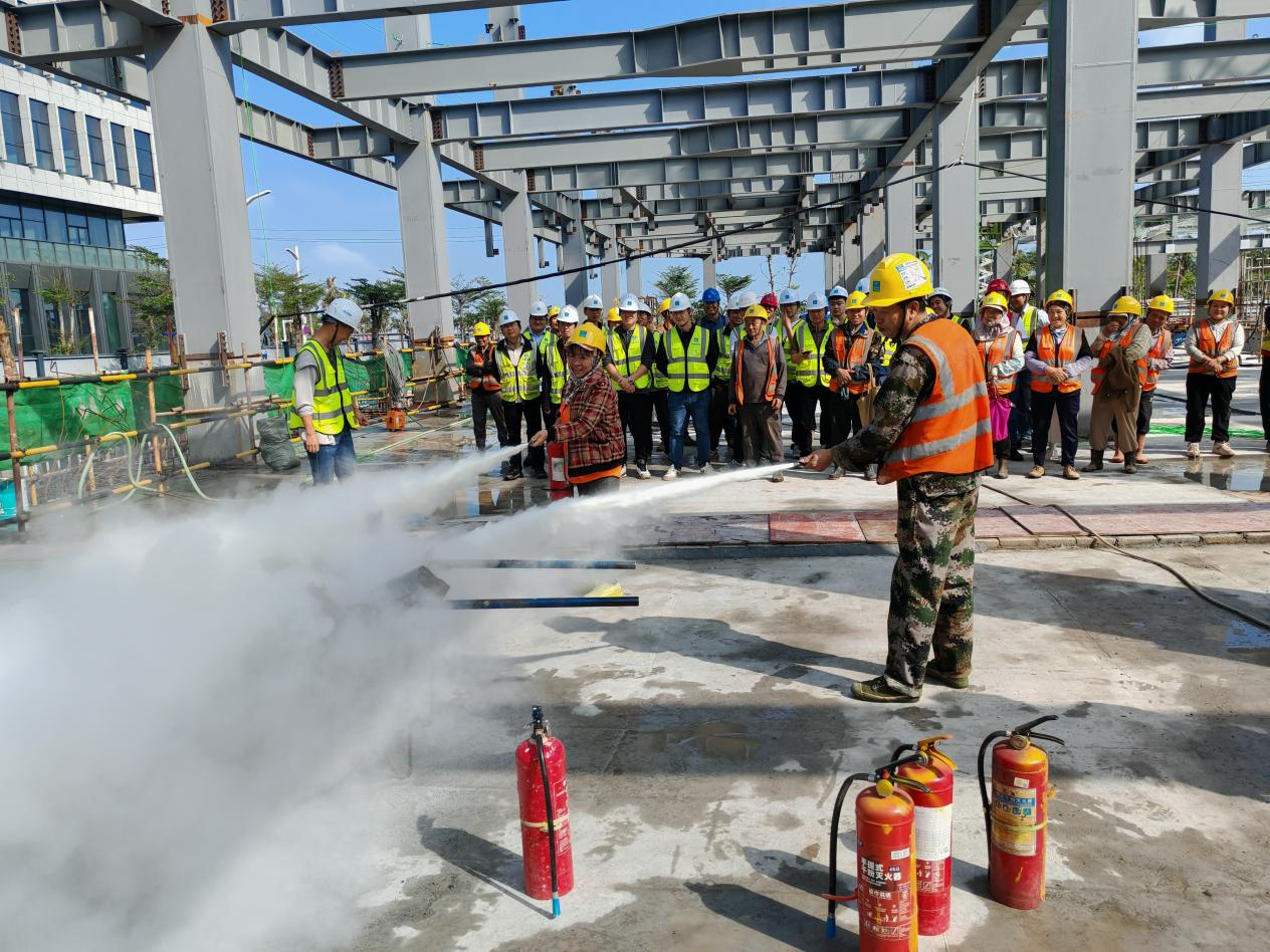 此次演练紧密结合项目施工特点,在演练现场设置了消防知识实操教学区。专业消防员针对施工现场常见的火灾隐患,详细讲解了灭火器的正确使用方法,并重点演示了钢结构焊接作业、易燃易爆材料存储等高危环节的防火注意事项。同时,结合海南冬季干燥多风的气候特点,着重强调了临时用电规范、动火作业审批、保持消防通道畅通等关键要求。现场员工积极参与实操练习,切实掌握了消防技能。
